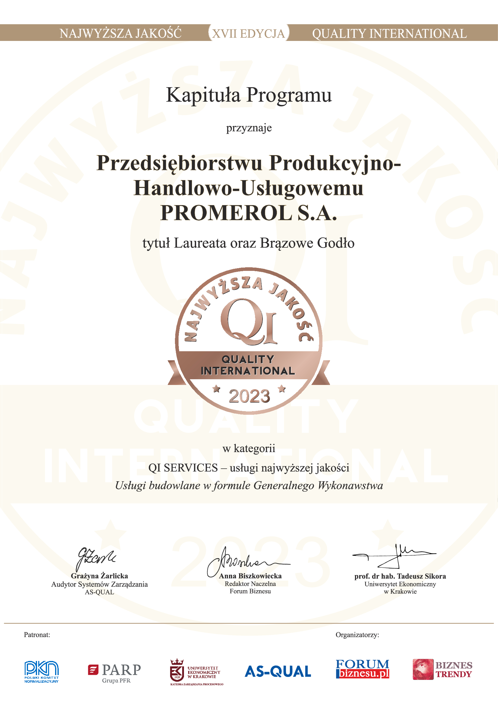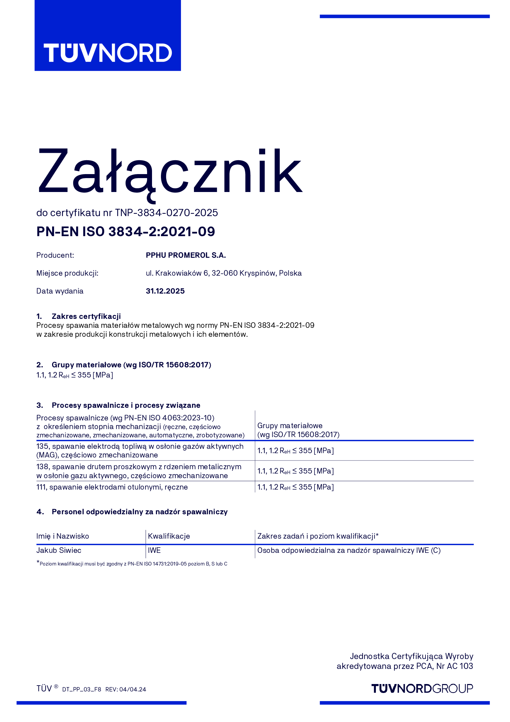 PROMEROL S.A. posiada certyfikat zapewnienia pełnych wymagań jakości w spawalnictwie zgodnie z normą PN-EN ISO 3834-2, wydany przez TÜV NORD Polska. Certyfikat potwierdza, że firma dysponuje odpowiednim zapleczem technicznym, wykwalifikowanym personelem oraz nadzorem spawalniczym, zapewniającym właściwą produkcję i kontrolę wyrobów spawanych.